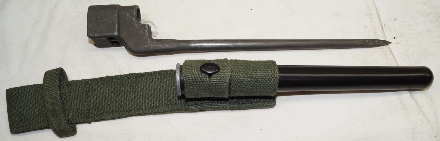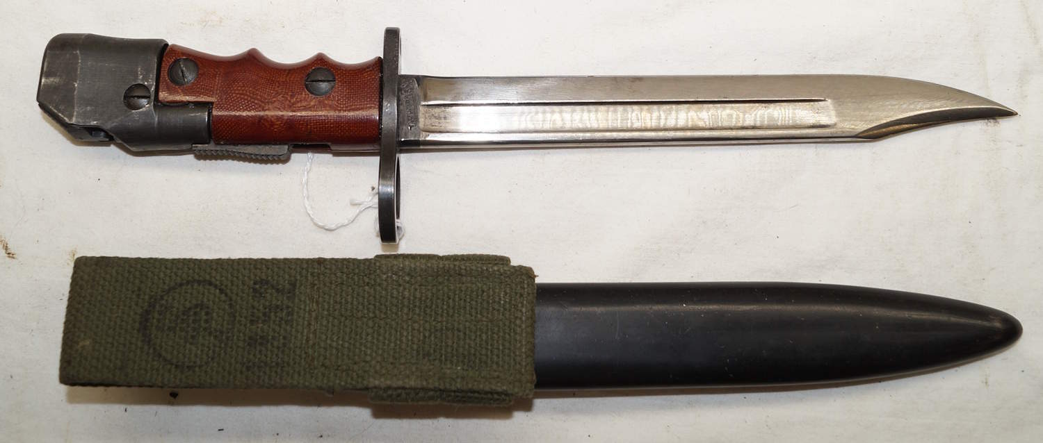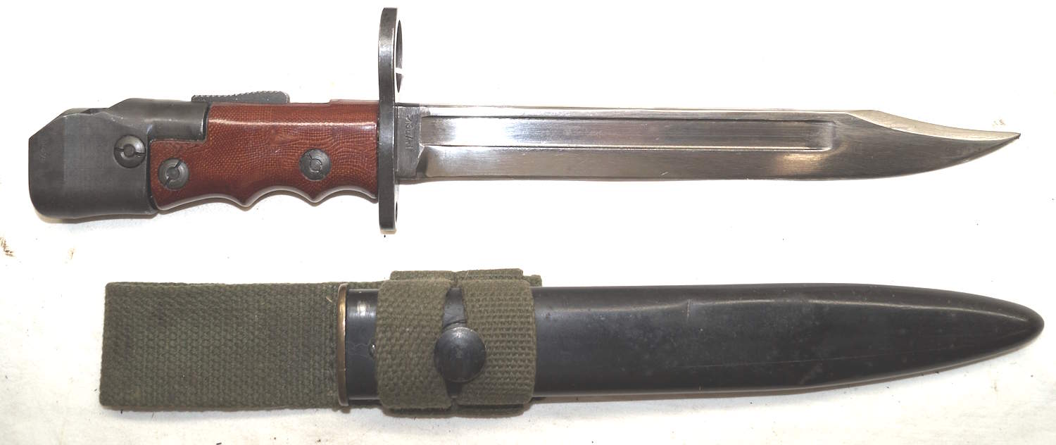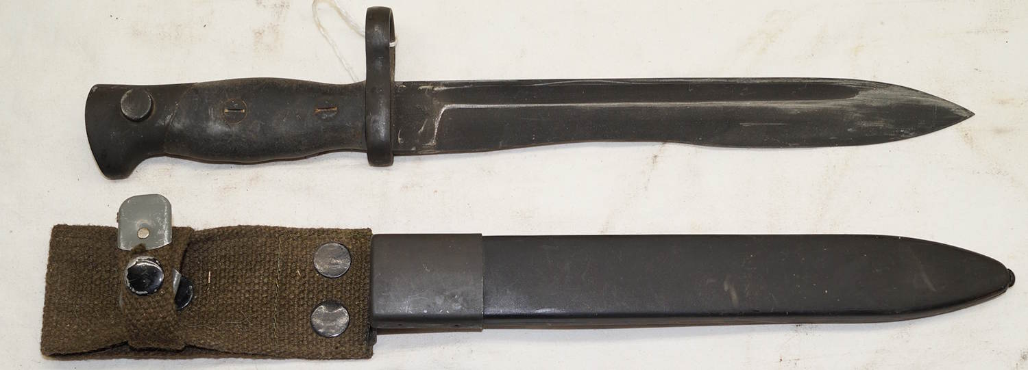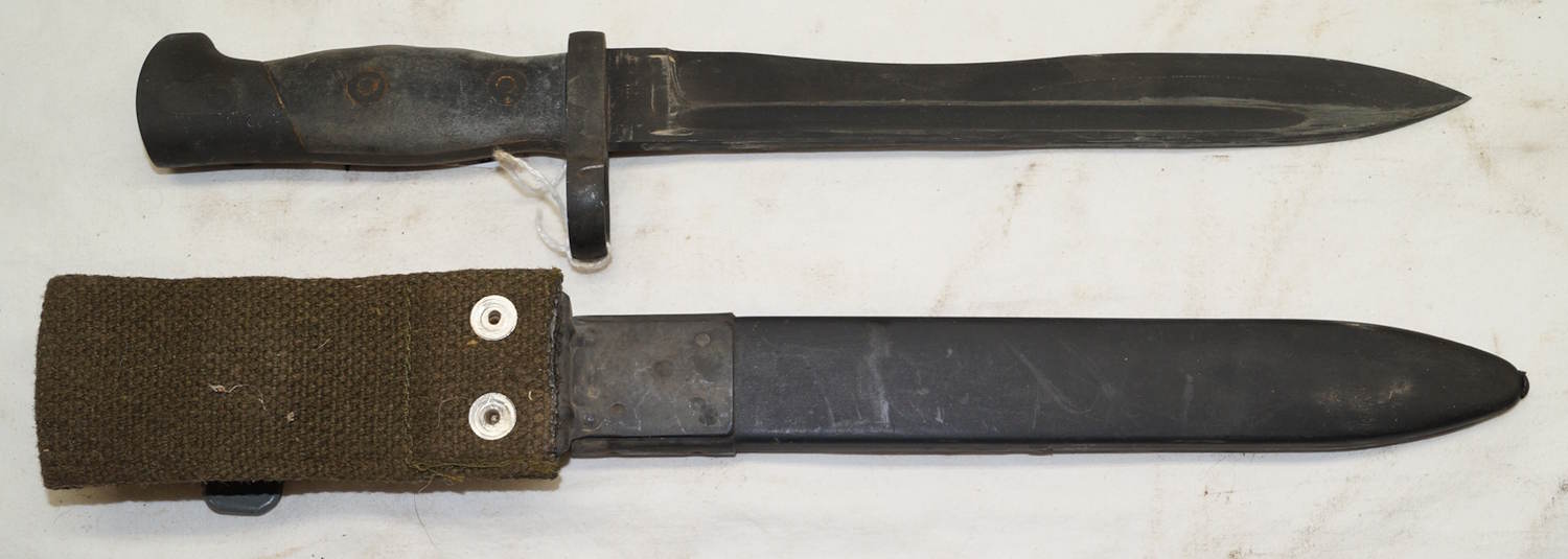 13367 M1969 CETME bolo bayonet with scabbard and integral frog. Unissued condition. Differs from more common Spanish model by having a smooth grip, diagonal pommel/grip line, different shaped catch, black scabbard and fullered blade.