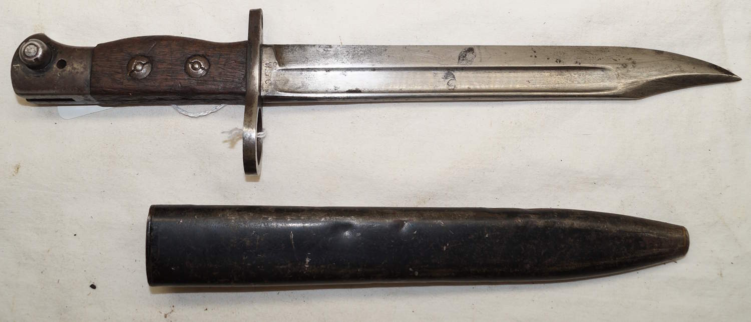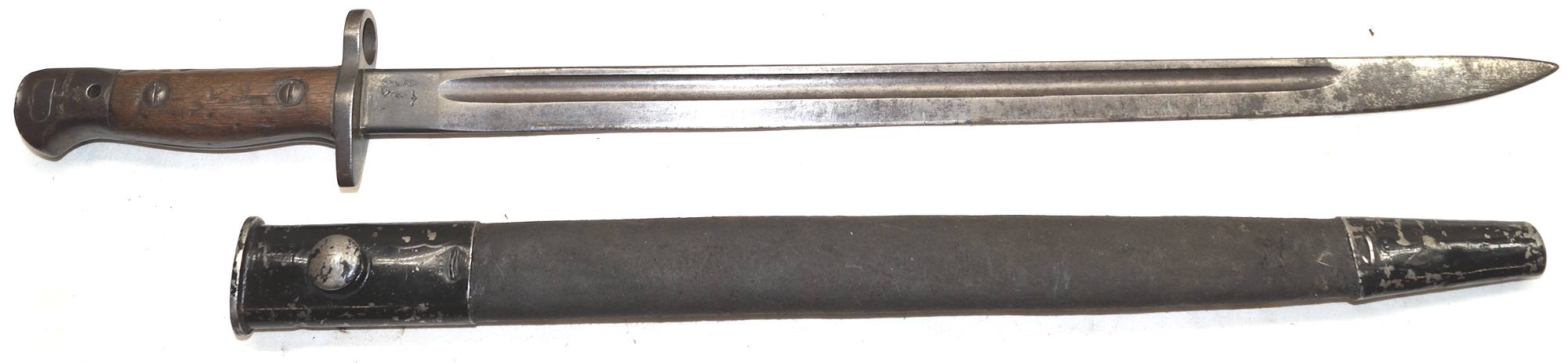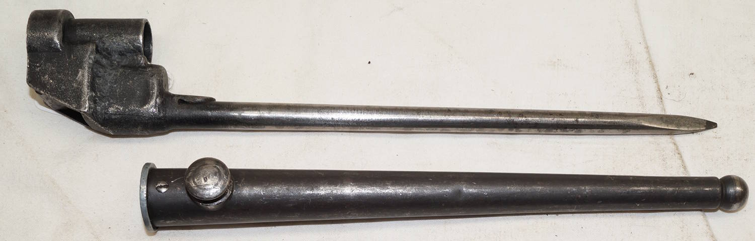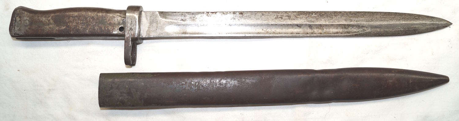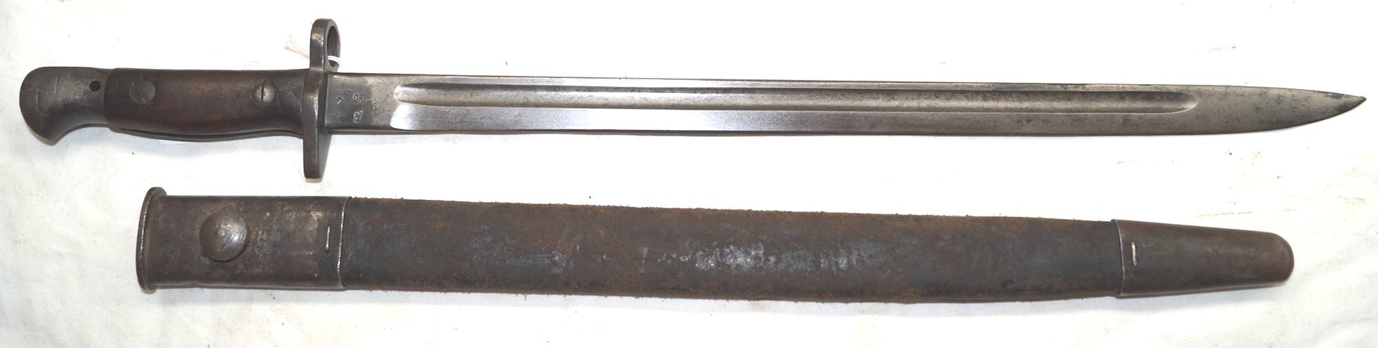 17208 S98/05nAmS Sawback bayonet with scabbard. No maker or cypher. Odd inspector marks. The tip of the quillon has been ground flat and 2 holes drilled in it and threaded.