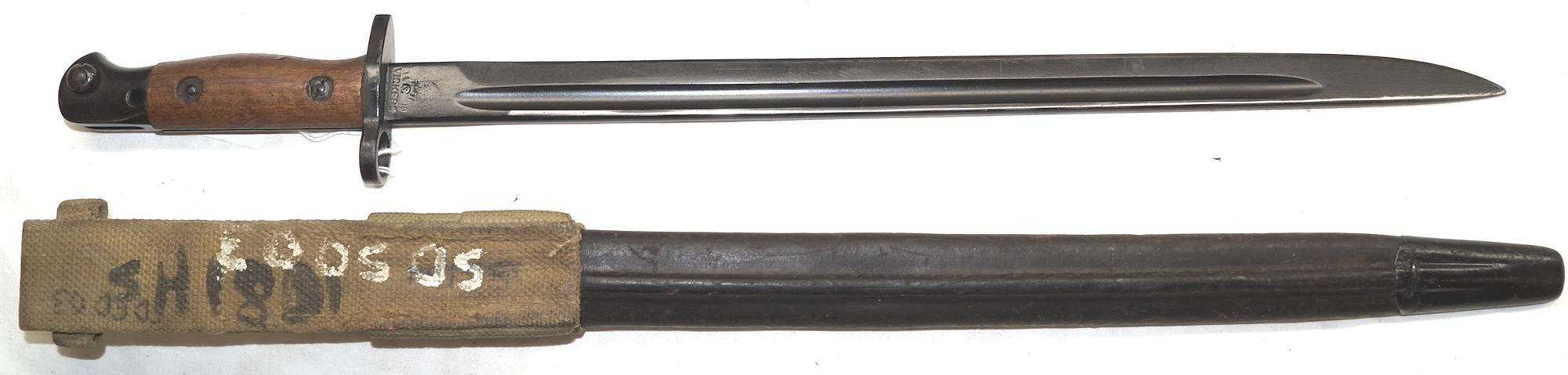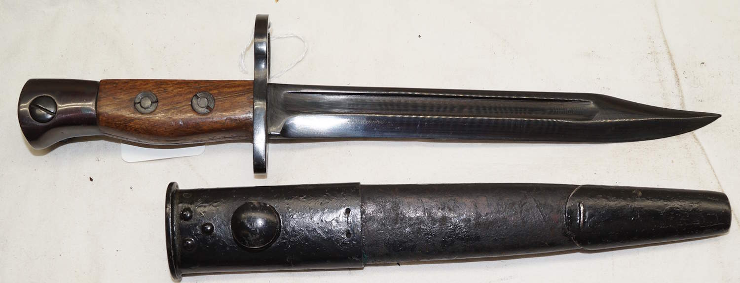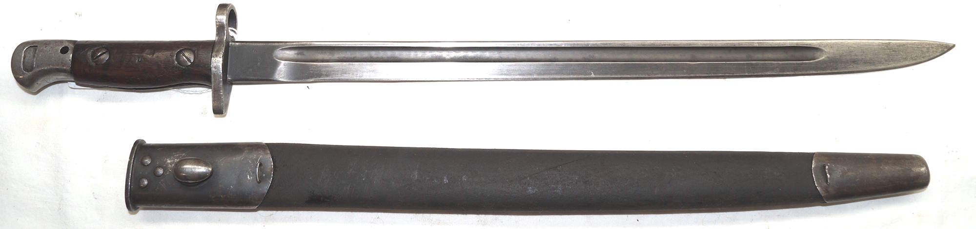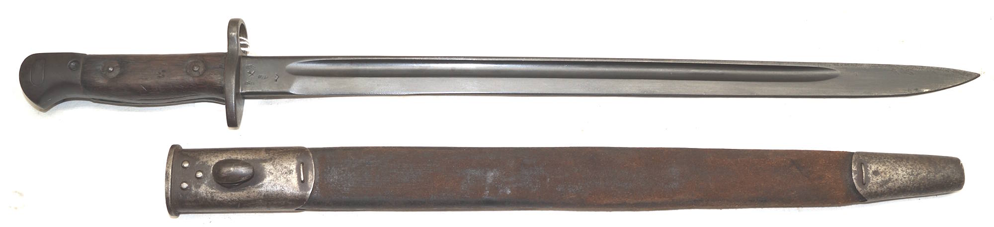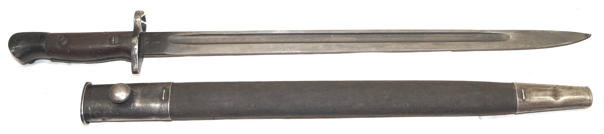 17208 S98/05nAmS Sawback bayonet with scabbard. No maker or cypher. Odd inspector marks. The tip of the quillon has been ground flat and 2 holes drilled in it and threaded.