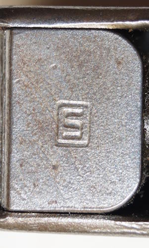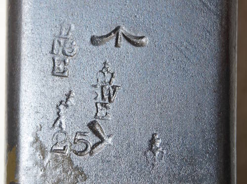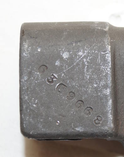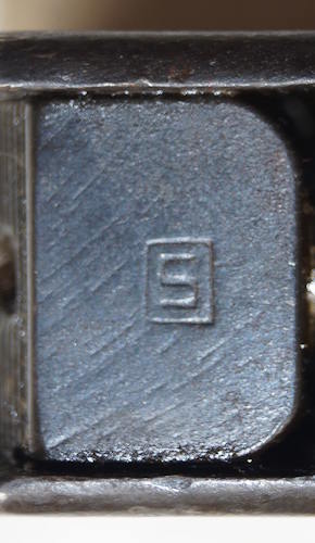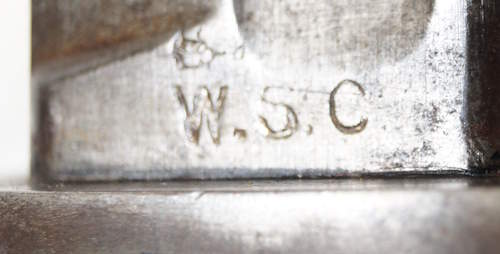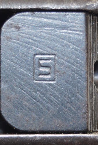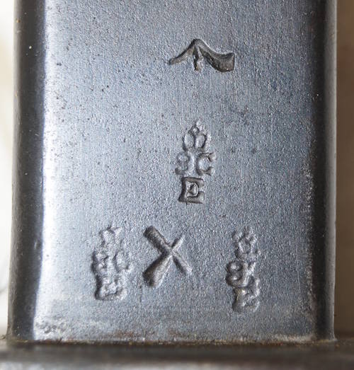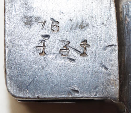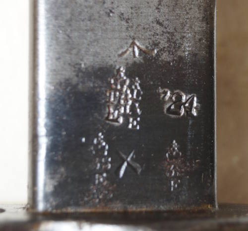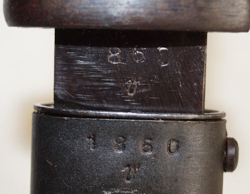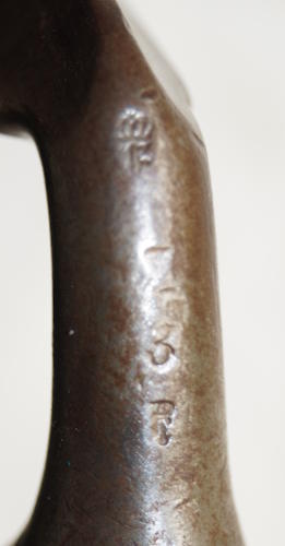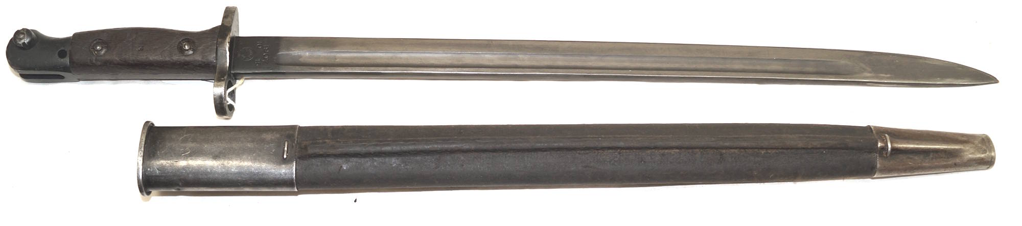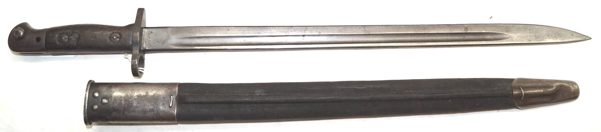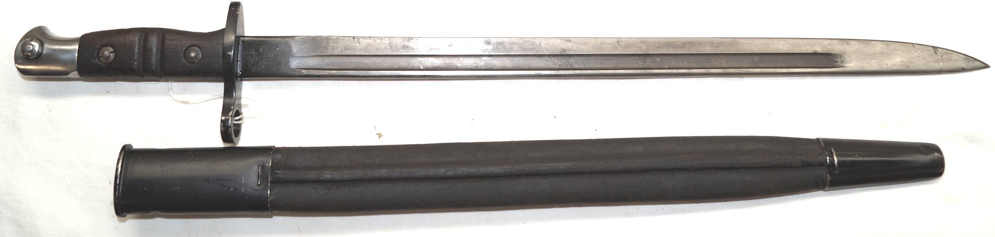 17208 S98/05nAmS Sawback bayonet with scabbard. No maker or cypher. Odd inspector marks. The tip of the quillon has been ground flat and 2 holes drilled in it and threaded.