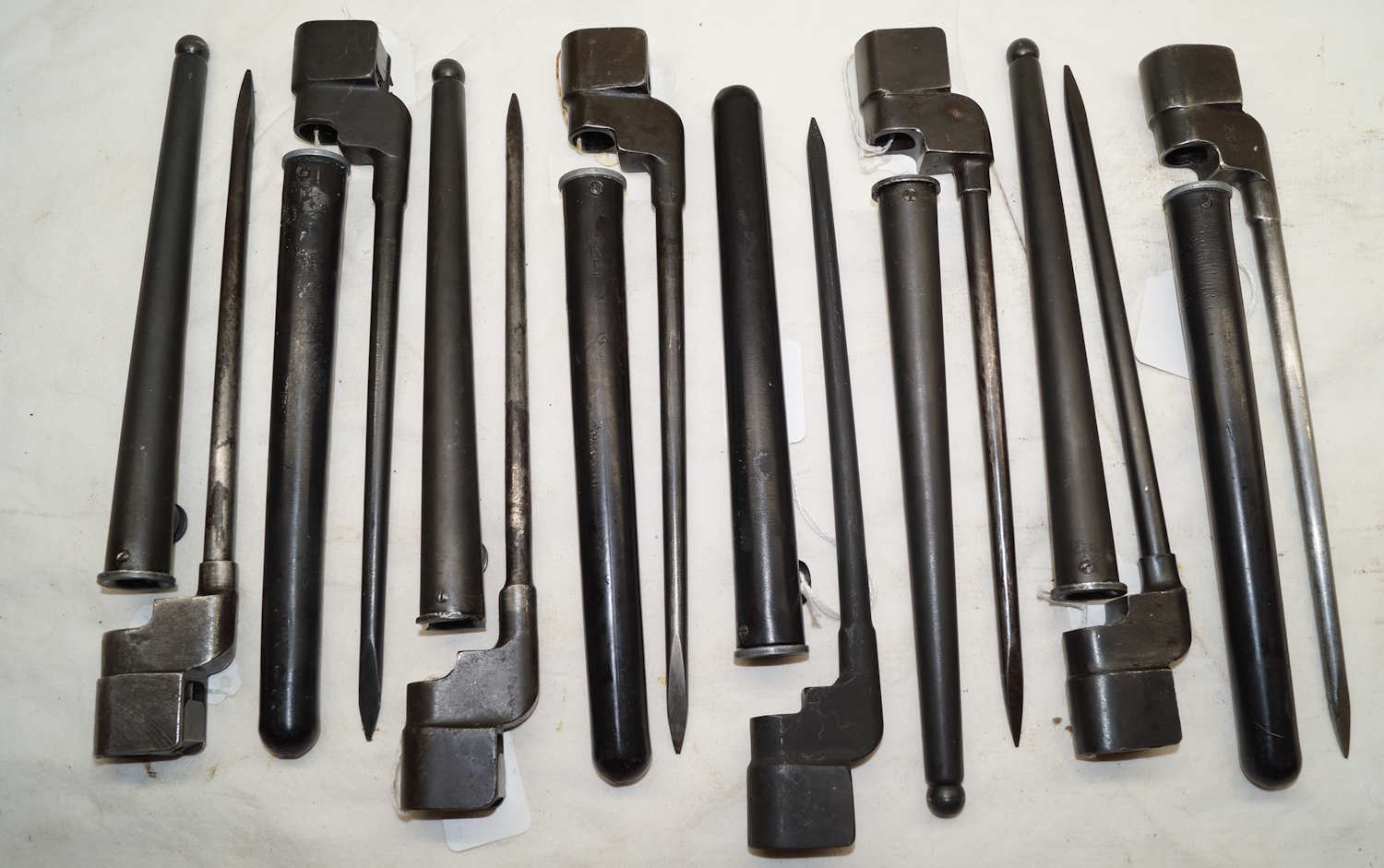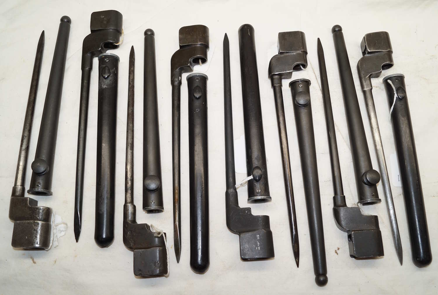 bayonet with a mixture of plastic and steel scabbards. One or two are in poor condition and none