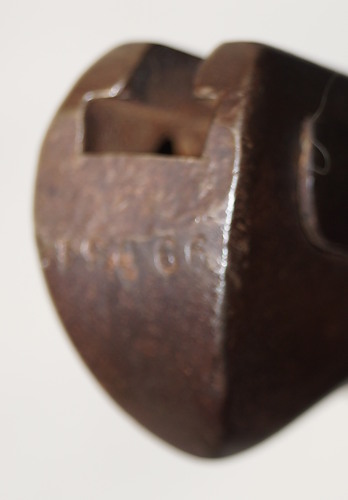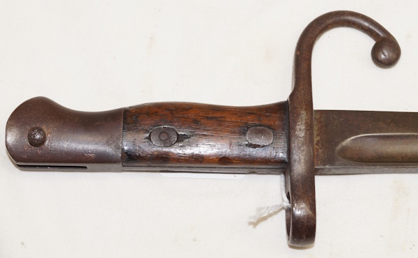 14388 M1910 bayonet with scabbard. Odd variation with uniquely Mexican grip fasteners and slightly different scabbard. Poor condition and missing the locking catch. Blade has grinding and nicks. Hilt and scabbard brown with surface rust but not pitted except on the left side of the crossguard. Crossguard marked "REPUBLICA MEXICANA" and finial ball of scabbard marked "RM" in a box. There is a small "R" in a box on the spine of the blade. I can find no indicator of who produced this bayonet.