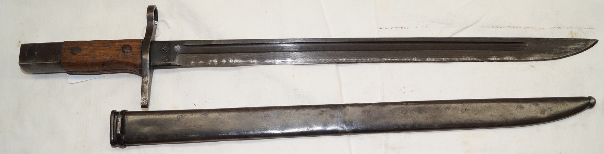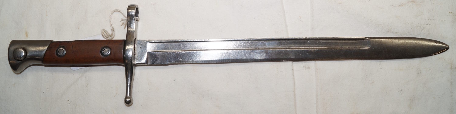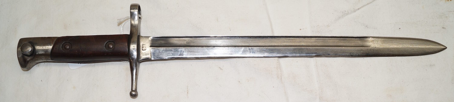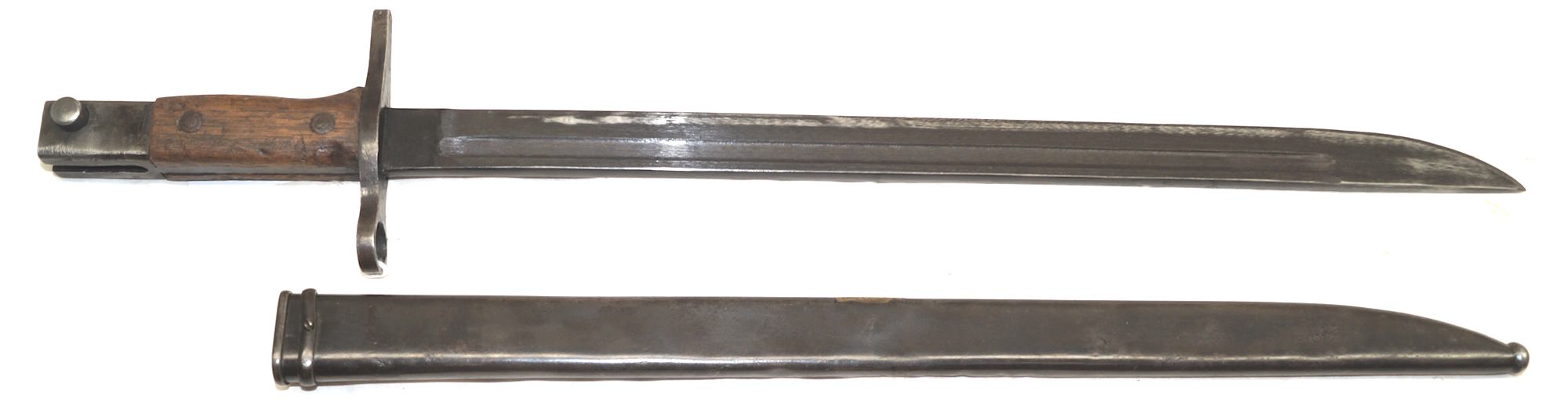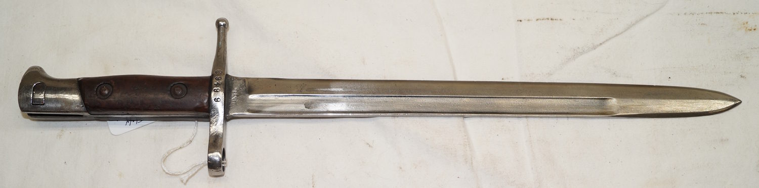 18354 M1914 bayonet with scabbard. SWISS CONTRACT copy of the Austian M1912 used by Mexico as the M1914. Marked with Swiss rifle over N on ricasso and another marking on the other side.