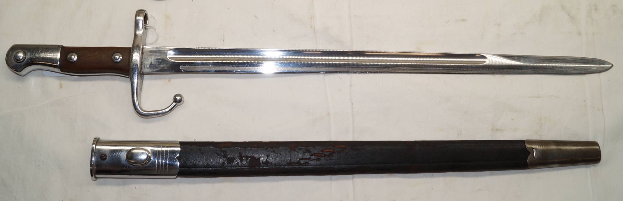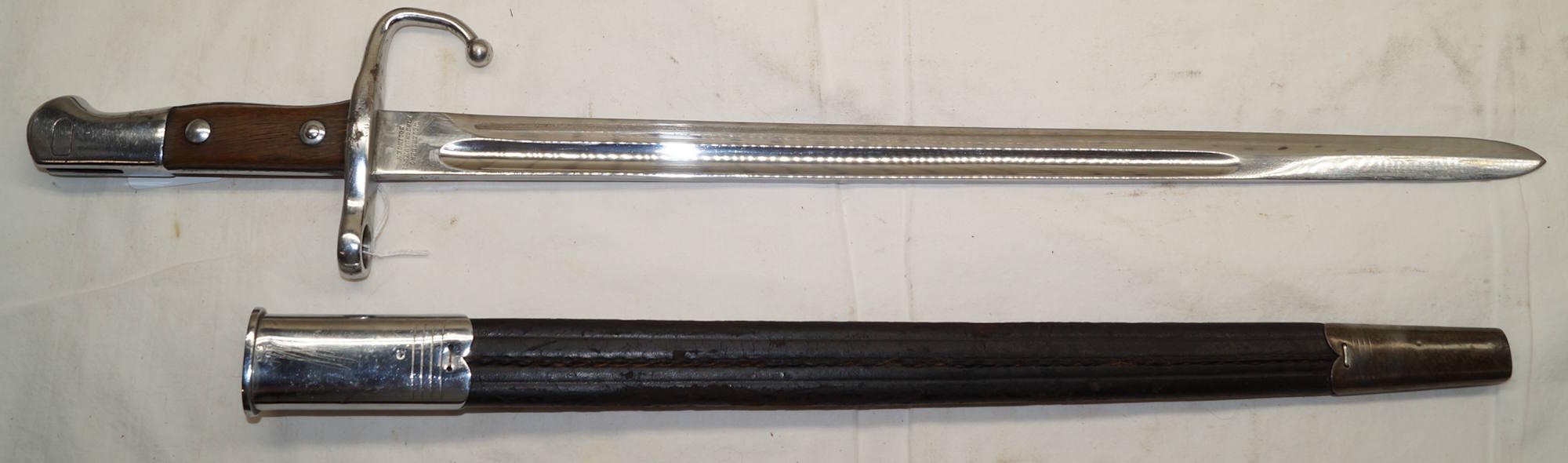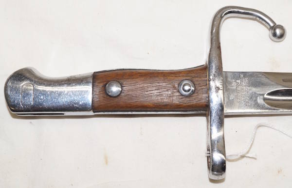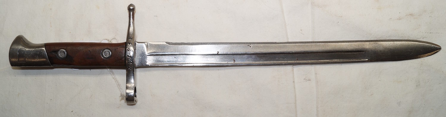 18354 M1914 bayonet with scabbard. SWISS CONTRACT copy of the Austian M1912 used by Mexico as the M1914. Marked with Swiss rifle over N on ricasso and another marking on the other side.